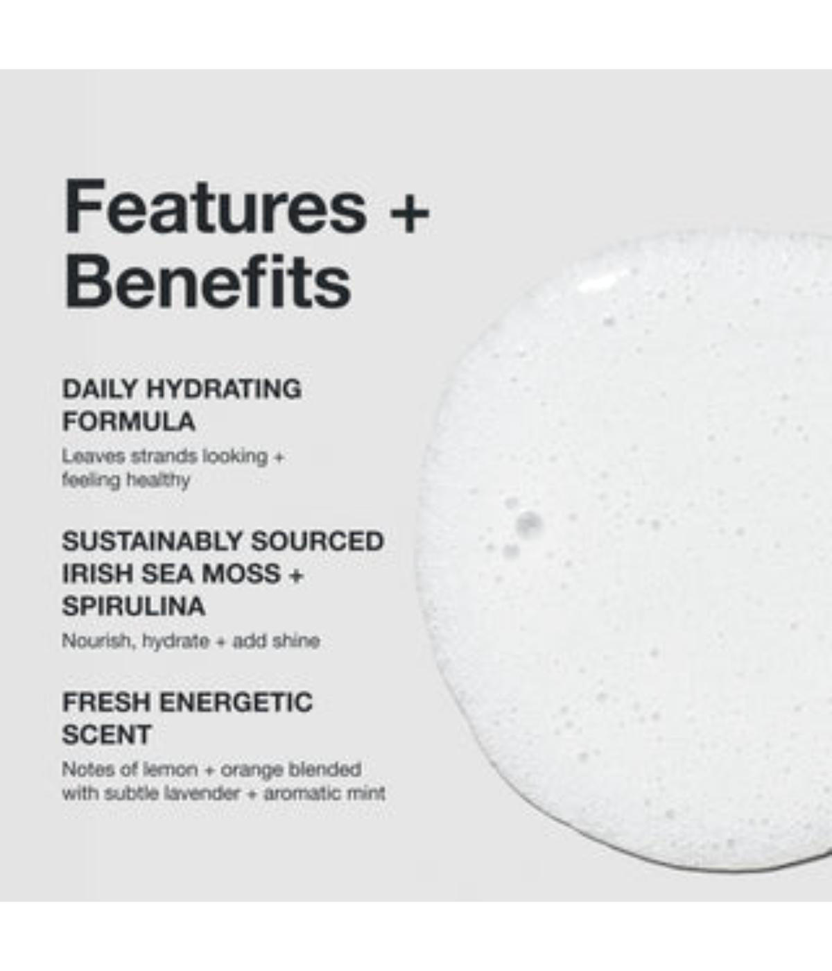 Moisturizing shampoo infused with sustainably sourced Irish sea moss and spirulina hydrates and revives dry hair while boosting shine.